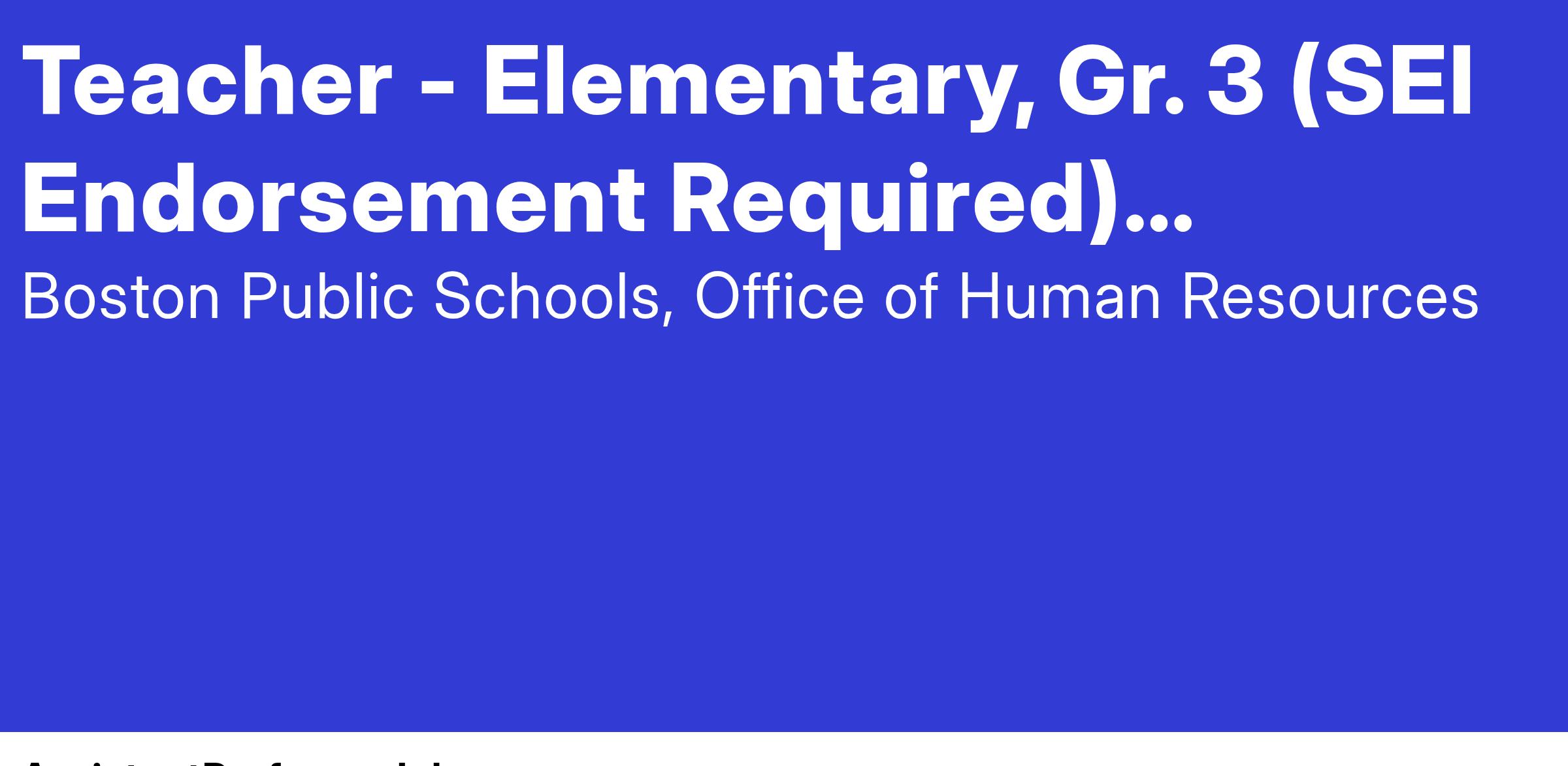 Boston Public Schools seeks an exceptional Elementary Teacher with an SEI endorsement who is highly qualified and knowledgeable to join our community of teachers, learners, and leaders. This is an exciting opportunity for teachers who desire to serve where their efforts matter.